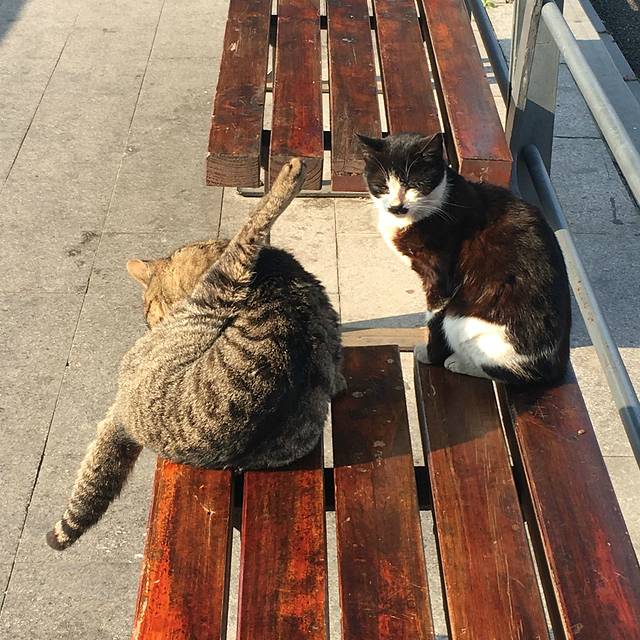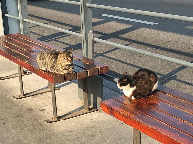 2017年2月28日,我们坐上从金山北(07:52)到嘉兴南(08:06)的高铁,15.5元,历时14分钟,凳子都还没有坐热,就要下车了。因为从金山北到嘉善南没有直达的高铁或者火车,我们必须从嘉兴南转车。08:36分坐上由嘉兴南到嘉善南的高铁(8.5元),08:45分到站,历时9分钟,又是凳子没热就急冲冲下车了。出嘉善南站,一眼就能看见公交车站,原本是要做K222公交车,但是公交车9:20才发车,到西塘大约需要55分钟,票价2元。旁边有景区专线车,票价8元,但是马上发车了,我们最终选择做专线车。在公交站发现两只懒懒晒着太阳的喵星人,看见我们给它们拍照,还做起高难度劈叉动作,萌到极致!