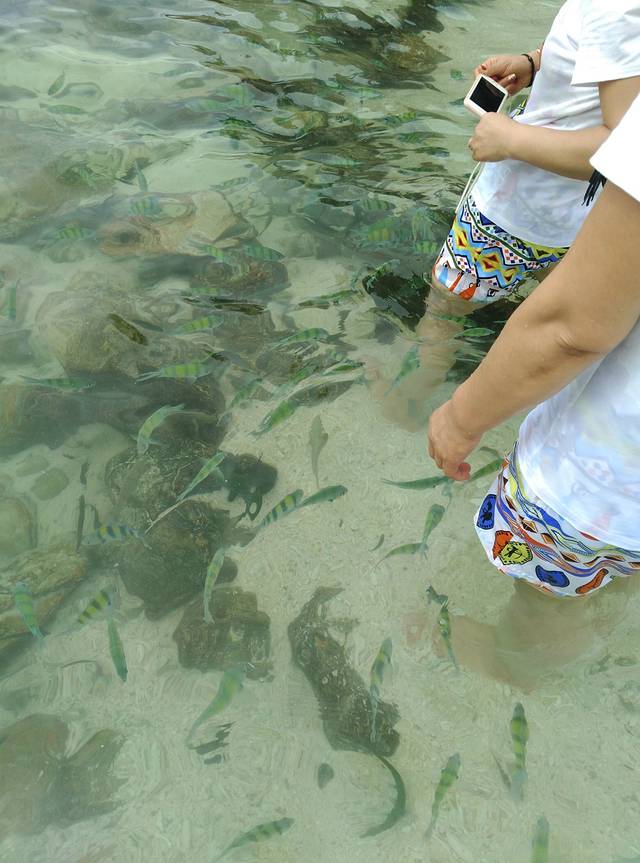 蛋岛喂鱼时间,好多小鱼,跟着浪拍上来~抓不着,