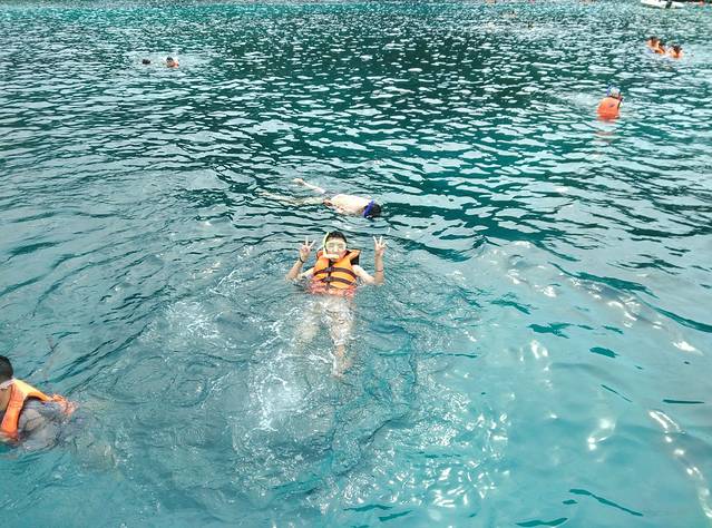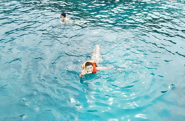 太阳下的海面还是很蓝的,至少浮潜我能看到海底呀~