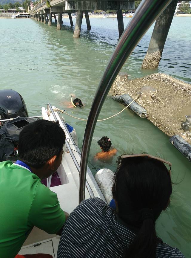 上船的码头。。。各位注意了,他这边没有踏板的,直接跳上船的,因此,各位的手机一定要放稳,不然一个晃荡,就跟这位仁兄一样,两部肾7双双落水。。。最后两位小哥下水去捞上来的,还没人给了100B辛苦费,我就默默的看看。不过不是肾7防水呢?