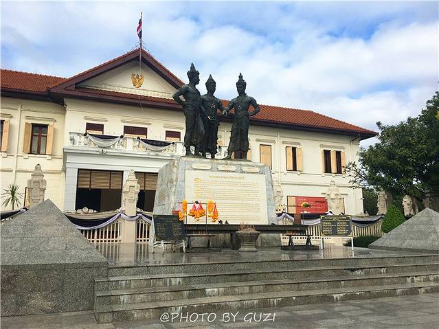 三王铜像,在清迈古城的正中央,协力建造清迈古城的三位国王,兰坎亨大帝、孟莱王、南蒙王,在泰北人民心中有崇高的地位,每天来此朝拜的人络绎不绝。古城游玩必定会路过这里,我也路过好几次,背靠着清迈市立文化艺术中心,清迈女子监狱也在三王纪念碑附近。有一大晚上我在广场右边的商铺门口绿色长条凳子上坐着等朋友。