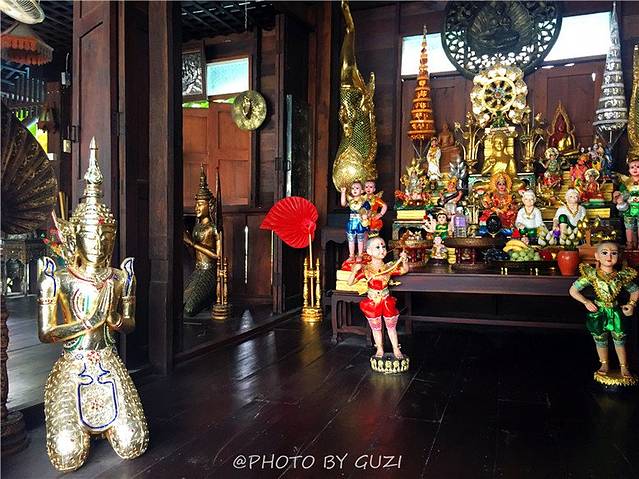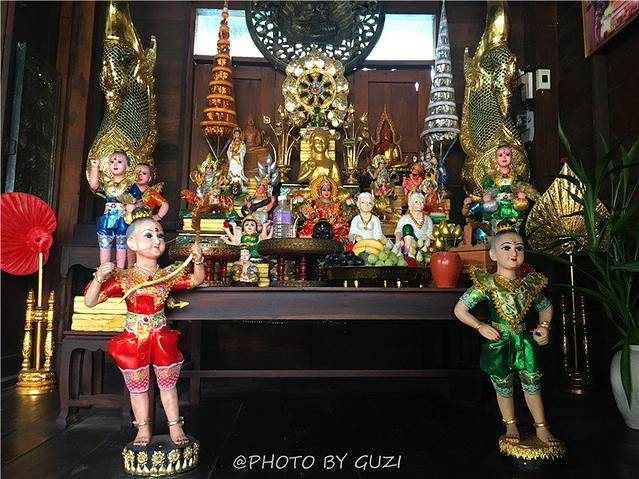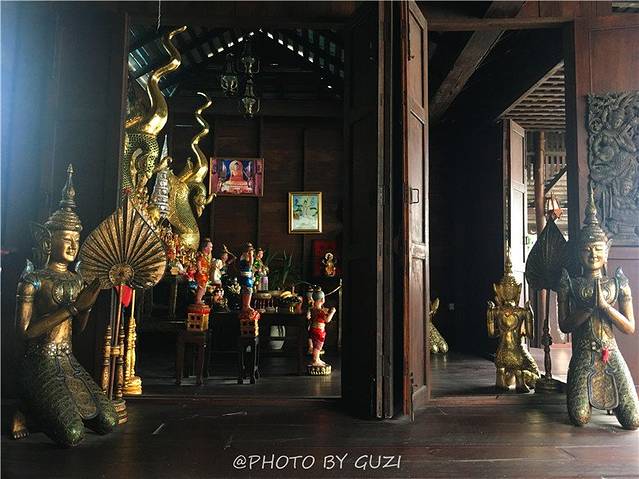 有一个小屋里面还有一尊大肚子的坐佛。寺内的图书馆和博物馆,其风格异于其他建筑。门口的两只神兽很有特点,做工繁复,白色,黑眼睛,有点像龙,又有点像兽。馆内有很多物品,还有高僧的蜡像、木雕、瓷佛像等。