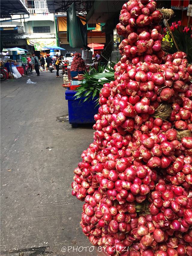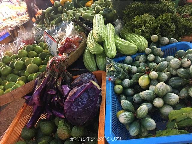 比起古城扎堆的餐馆,直觉告诉我,菜市场更有趣。那些应接不暇的食材,被大自然施了魔法一般,水果一堆堆地似小山,各类品种的芒果、香蕉、菠萝、西瓜、牛油果、香瓜、榴莲…才从枝上摘下来的青红相见的番茄,远看像长有一颗颗红宝石的洋葱树…