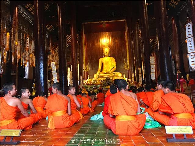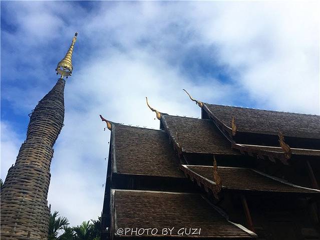 潘道寺在契迪隆寺的隔壁,朱红色的门,朱红色的墙,一进门满眼都是黄色,宝塔状的一排竹筐上插满了黄旗。潘道寺又名柚木寺,寺里有一座巨大、古老的柚木大殿,纯兰纳式的设计,超过280年的历史,是目前为数不多的木造建筑之一,是清迈的无价瑰宝。