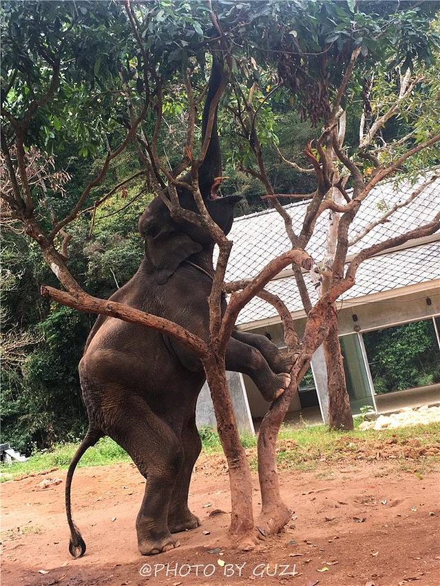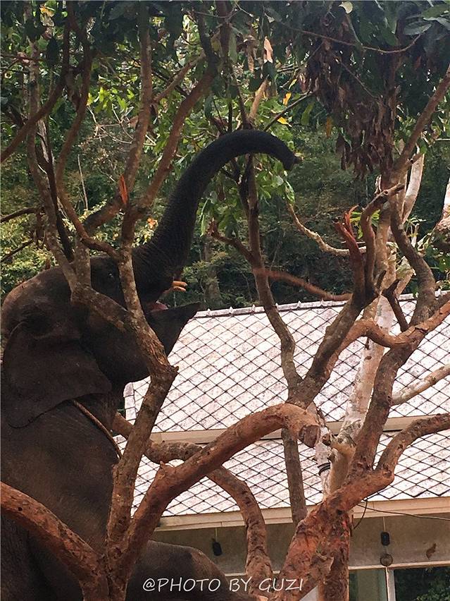 “偷拍”了训练场外的一头“自由”的大象,如此矫捷的身手,才是真真儿令我佩服。这个大块头,前腿一下子就搭到树上,用鼻子卷树叶吃。这个时候,它好可爱。