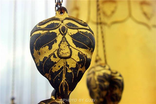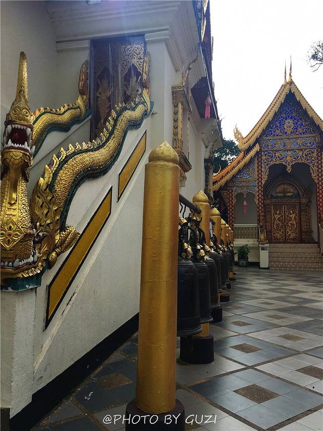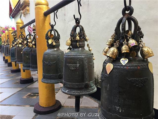 在寺庙林立的清迈城里,潘道寺的规模算是比较小的,但却很精致,一进大门左手边有一排铜编钟,钟鼎上方有四条精致的蟠龙,红色的小伞遮挡其上,很特别。