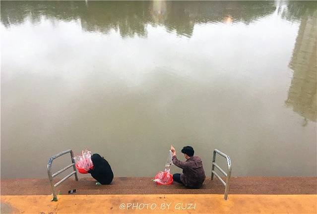 去得途中,发现两位善心的人在放生,袋子里装满了小鱼。