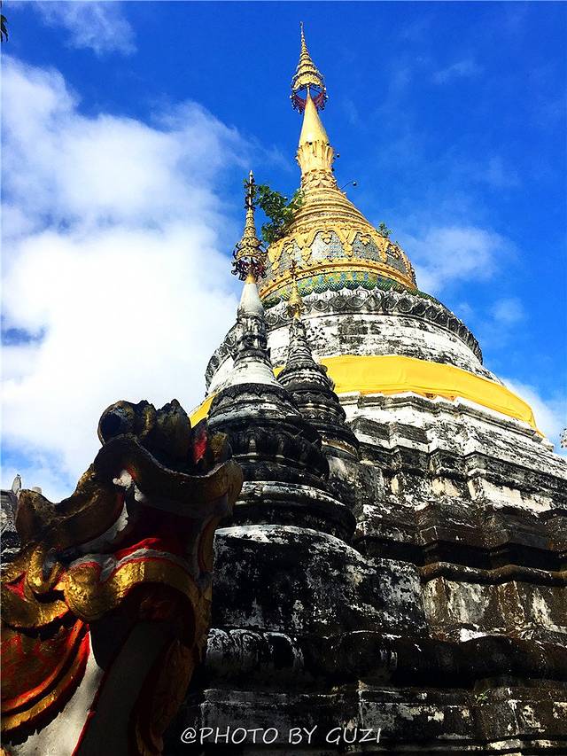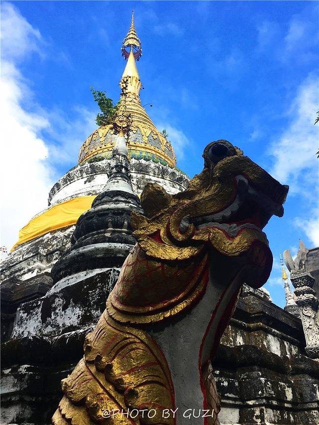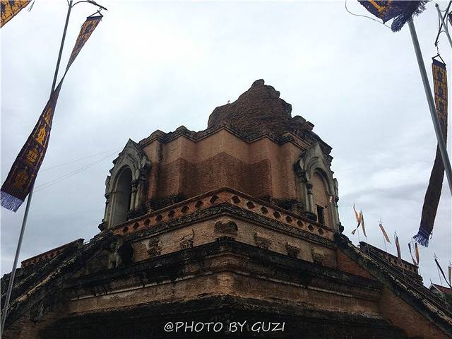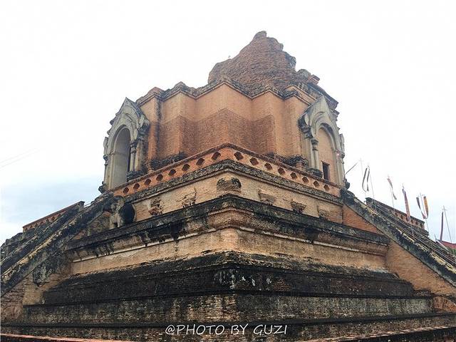 佛塔建成时高达85.4米,在1545年清迈发生一次大地震和大风灾,佛塔的尖顶一夜之间塌毁,露出塔内的金身佛像,但依然是城内最宏伟的建筑。佛塔下面的那伽经过了500多年的沧桑岁月,虽颓垣断堑,却依然高昂着头,静静地护卫着佛塔。