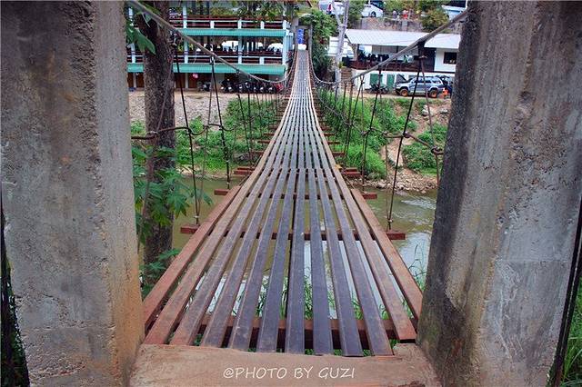 这座铁桥,横跨江流,挺险的,走上去佷晃。从对面过来就是大象训练营,长颈族村。竹筏漂流、丛林穿越,都在这周围。