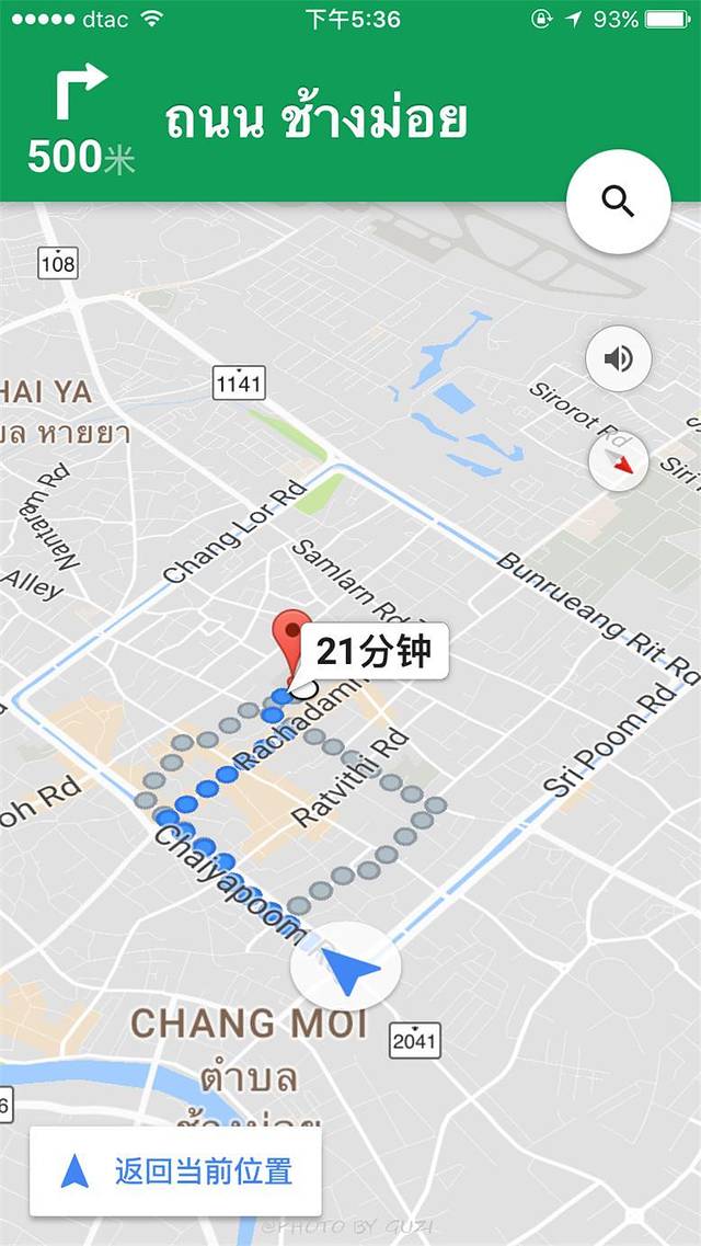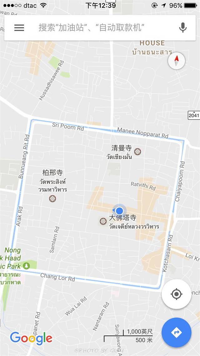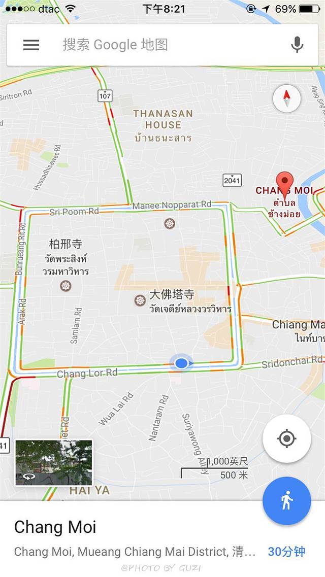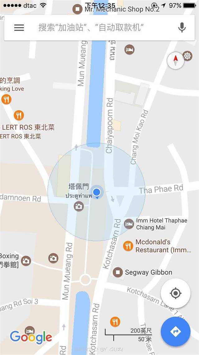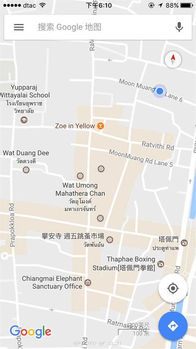 Google 地图非常实用,自己找路,或给司机师傅看地图,可以随时随地知道你在哪儿。看上图很清楚的地标--塔佩门,以及Zoe in Yellow 酒吧街。