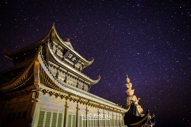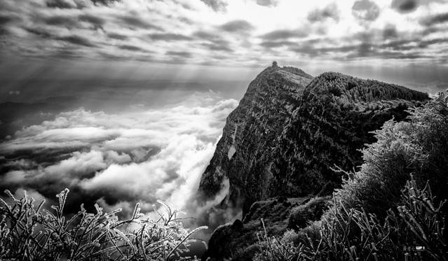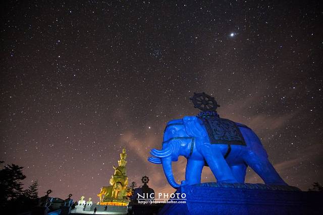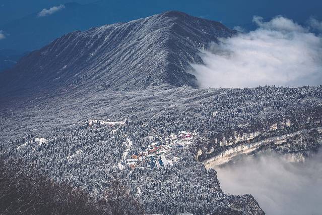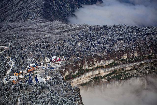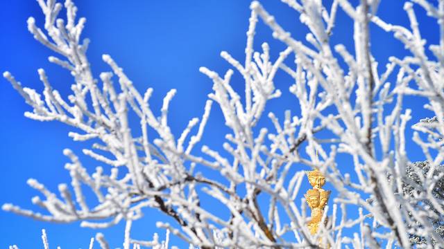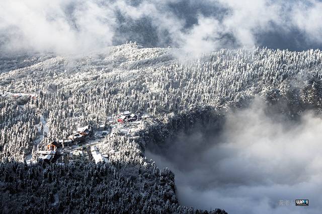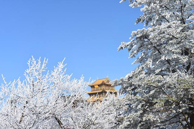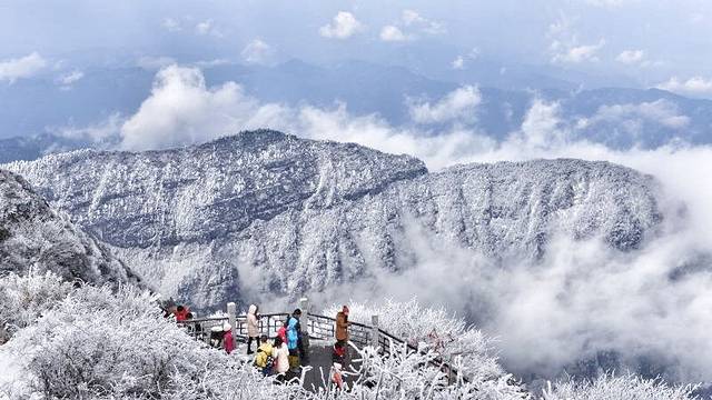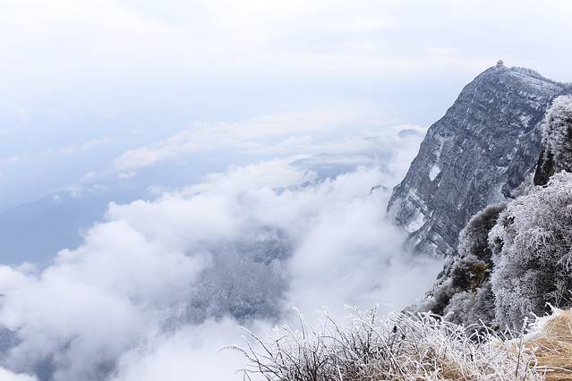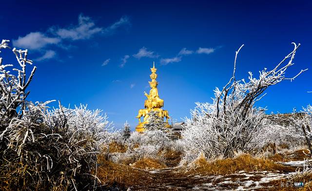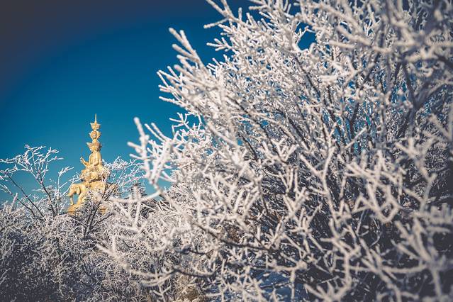 峨眉山是中国四大佛教圣地之一,东汉时期就已建有道教宫观,修建后的佛像更是金碧辉煌,透着雾凇看过去像是神仙居住的地方