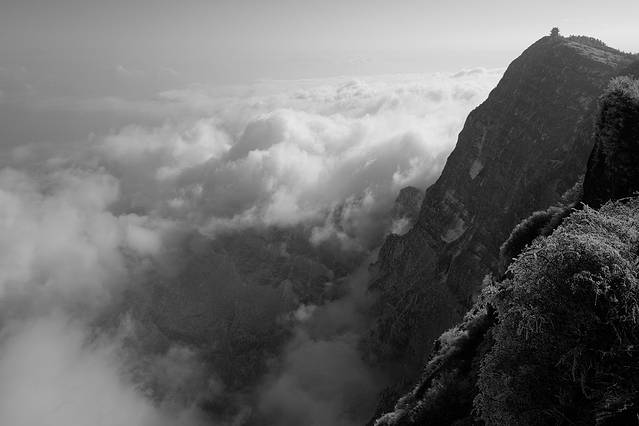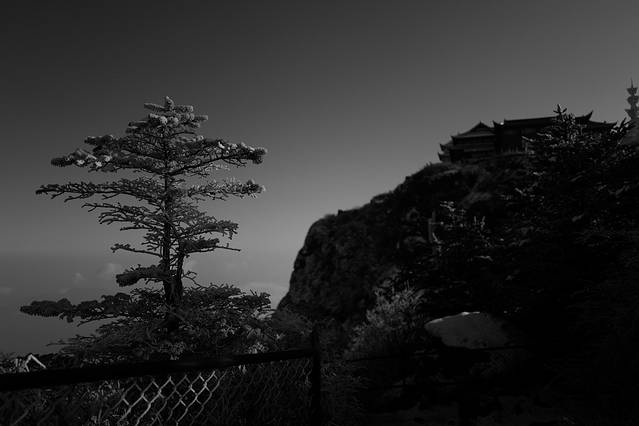 而金顶的日落是雄伟的,气势汹涌的,配合着云海的滚动,让人在零下几度的寒风中也不觉得冷