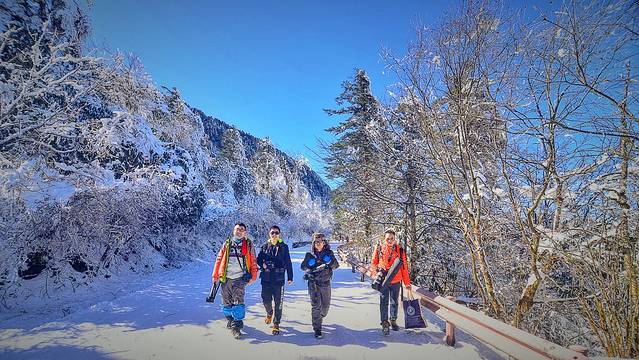 2小时后整装待发,我们有2公里的徒步路程,昨天刚下过大雪,大家开始上冰爪