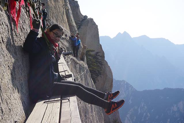 4.到了栈道,真的不恐怖,我们上的几个人真的玩high了!因为我挂着相机,不停的让他们摆pose拍照!