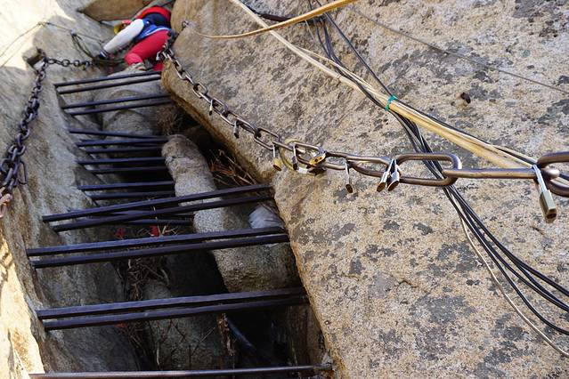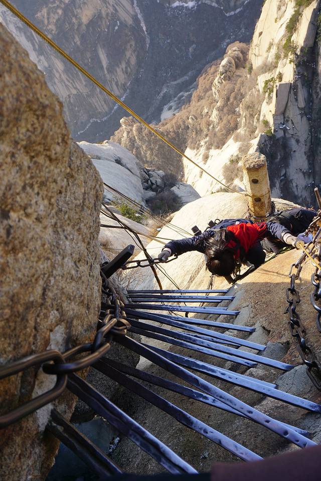 3.先是一段90度的铁条路,个人觉得这个比栈道吓人,还有一段悬崖石头路(在悬崖上凿出半个脚的大小供人踩着走!)