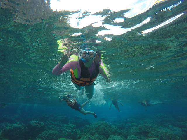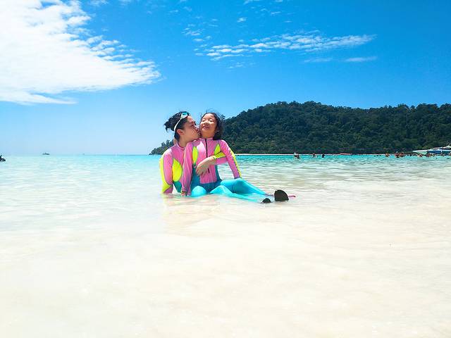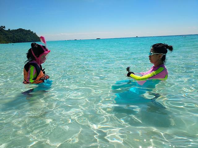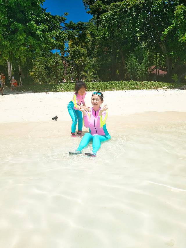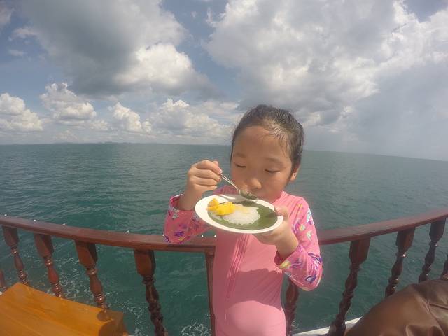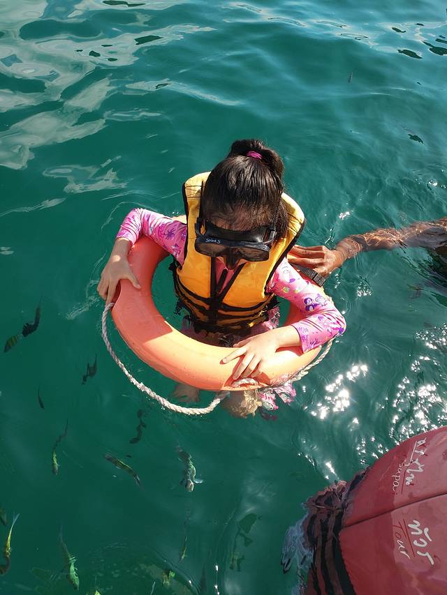 浮潜的用具船上有,当然为了卫生建议自己带,浮潜的地点小鱼群超级多,成群成群的小鱼在你身边游来游去,如果你喂它们米饭或者面包,更是密密麻麻的冲过来,妞妞对动物比较恐惧,但是船长yaya问她要不要try it ,她勇敢地点点头,已经很棒了,出乎我的意料,带着救生衣很安全,穿法正确是不用担心危险的。因为前阵子沙巴有沉船事件,所以救生衣我一直穿的很认真,而且出行前手机里也存了中国大使馆全球服务应急呼叫中心的电话,事实看来,泰国比马来西亚对安全要重视,救生衣下面那个带子是套在腿上的,如果你没带好,船员都会帮你检查帮你重新系好的,也不允许超员现象存在,多一个人也不行。