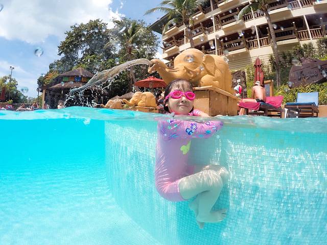 酒店的泳池有两个,一大一小一深一浅,就孩子玩还是很不错的,旁边有小水吧可以叫小点心和饮料,度假就是要休闲,晒晒太阳看孩子们戏水,很舒服。