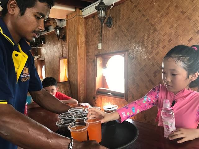 今天上午到街上逛了一圈,下午包了一个four island tour,半天的行程比较休闲,包括两次浮潜,一次上岛玩,还有海上BBQ晚餐,晚7点返回,孩子很喜欢,休闲又享受的离岛行程,应该是去甲米必玩的。