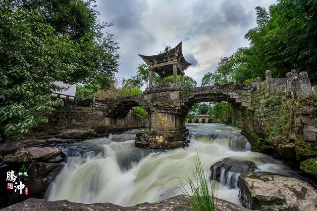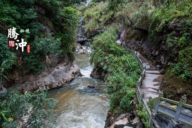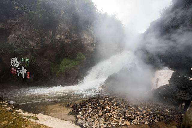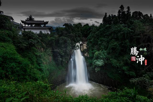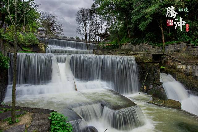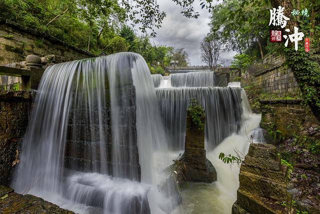 国内唯一的城市瀑布,在瀑布附近稍站片刻就会被飞溅的水雾沾湿。从观瀑台远看,一片仓绿之间叠水河瀑布犹如一带白绢落入深潭,这种奇景又被腾冲人称为“龙洞垂帘”。