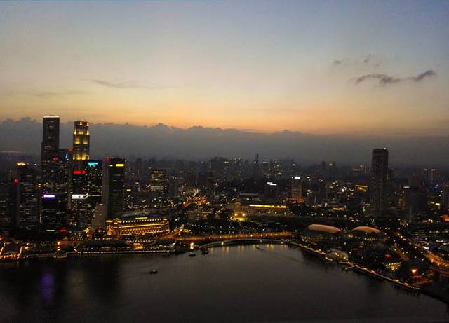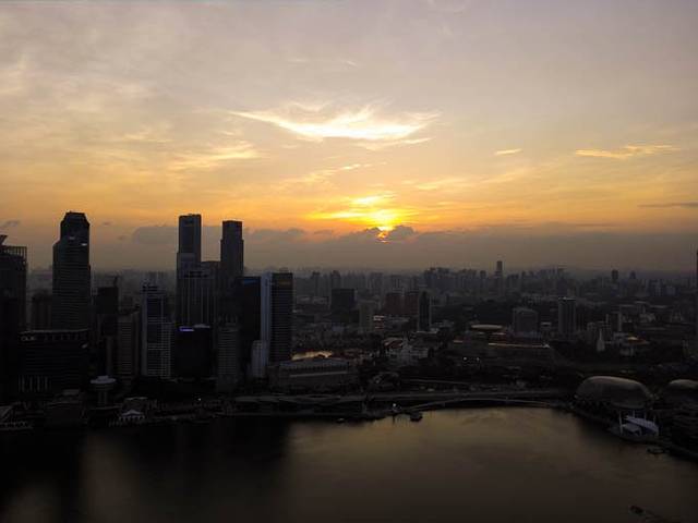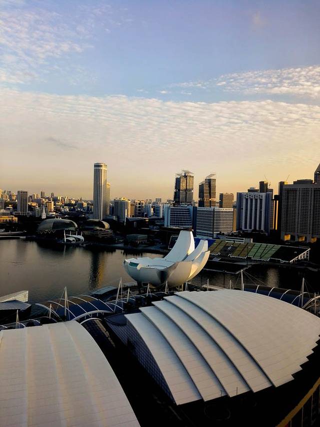 窗外是滨海湾花园的美景,黄昏,夕阳染红天际,鳞状的白云附着在干净清澈的天空,新加坡的美让人陶醉。