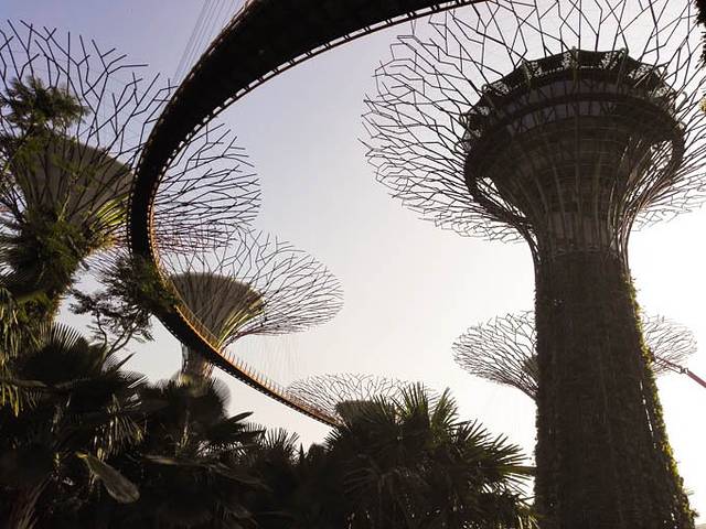 擎天大树的“树冠”白天可以遮阴。入夜,五彩灯光和投射多媒体将这座垂直花园打扮得妖娆多姿。两棵擎天大树之间有空中步道相连,还方便了游客从不同的角度欣赏滨海南花园的美景。