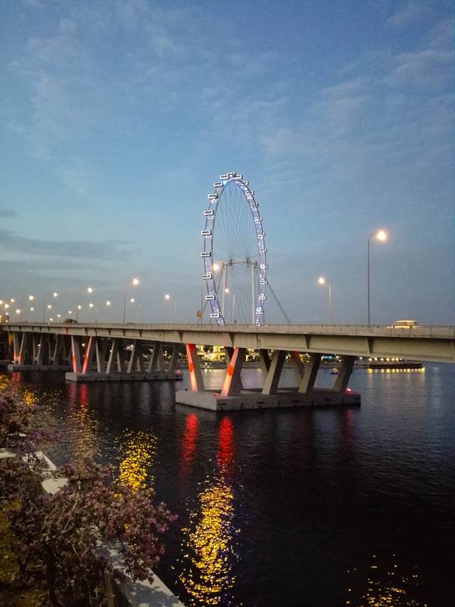 摩天轮坐落在滨海中心填海得到的土地上,从摩天轮上可以将众多标志性和历史悠久的地标尽收眼底,还能远眺直到约45公里外的景色,包括印度尼西亚的巴淡岛、民丹岛,以及马来西亚的柔佛州。
