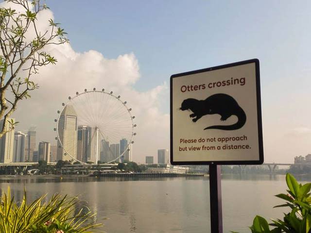 滨海湾花园两岸经常会有水獭出没,它们有时候跑到岸边来晒肚皮,所以在岸边立有不少警示牌,告诉人们可以远远地观看,但是不是接近它们,人类和大自然是一对亲密的好朋友。