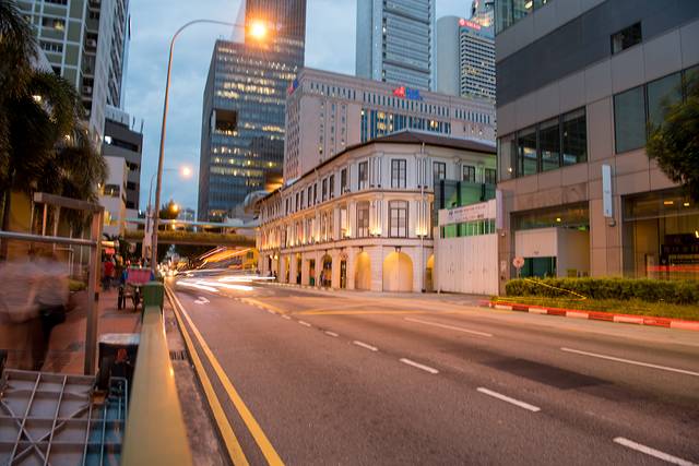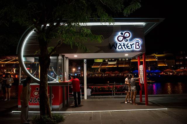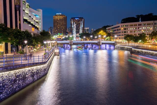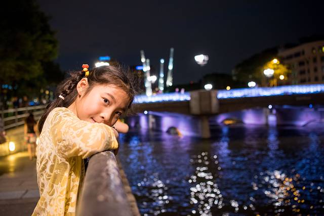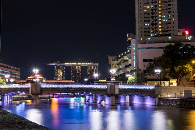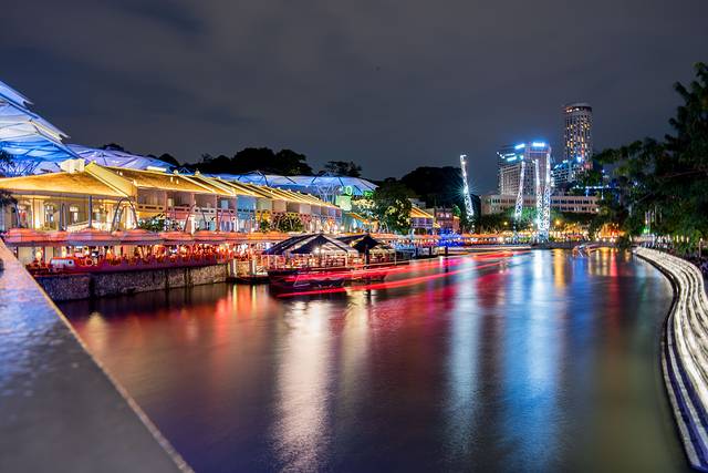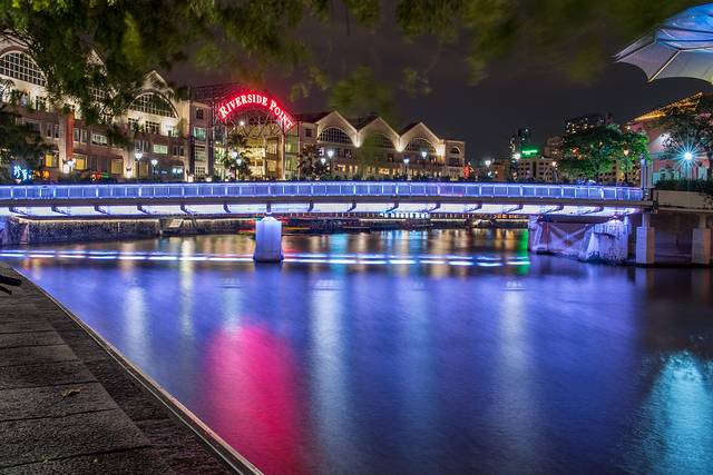 一路逛一路拍大约30分钟就走到约克拉码头,夜晚的码头灯光迷人,新加坡河上不时有游船经过。