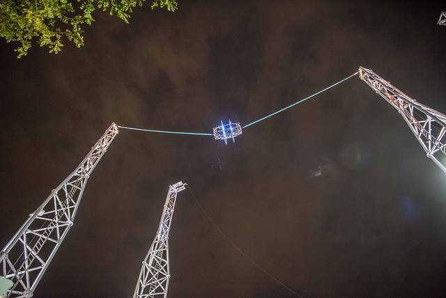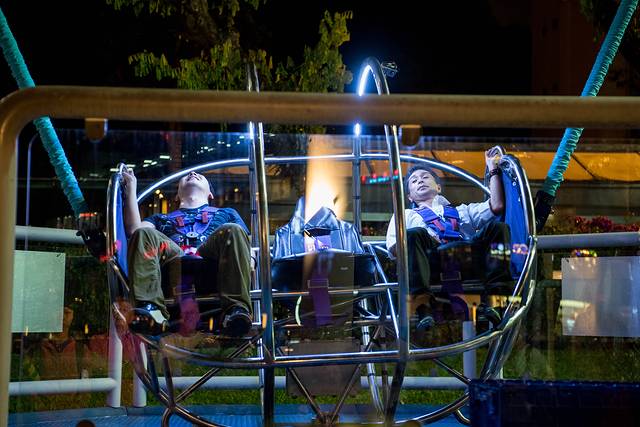 准备“升空”前的准备,开始后大约等个1分钟不到就“嗖”的一下在几秒钟内被抛到空中。不过这两位上去后没听到预期中的尖叫声,就是下来后脸色泛白。