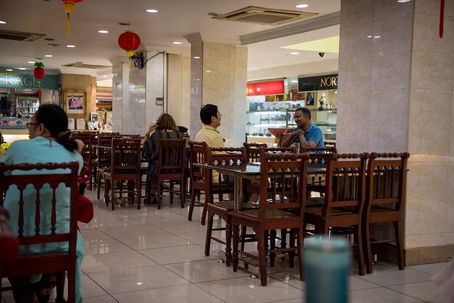布置,果真一进去都是印度人,大堂看上去还算干净。也许是没到吃饭时间,人并不多,像是在喝下午茶。店堂布置有点像国内的“大食代”,都是一个一个柜台来的,不过可以统一点餐。