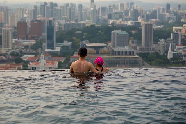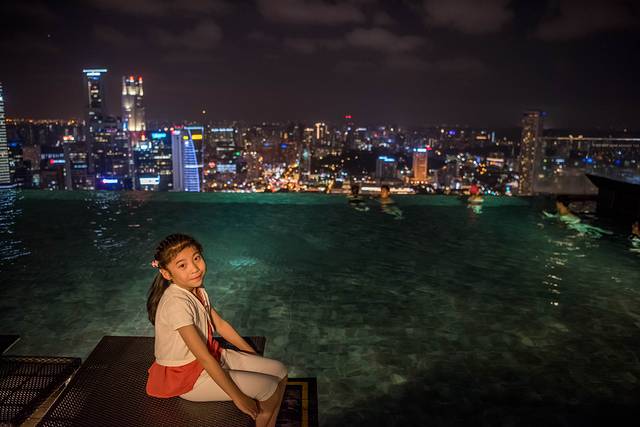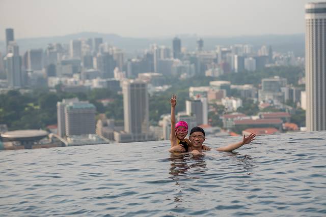 ▲世界上楼层最高的泳池——Marina Bay Sands的无边泳池,和小妞远眺傍晚时分的滨海湾。
