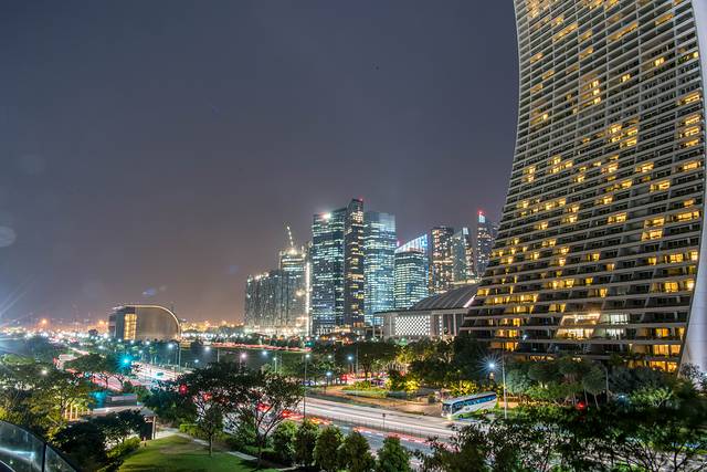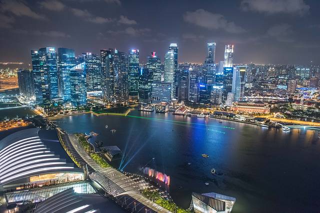 ▲夜晚的滨海湾金沙酒店(Marina Bay Sands)灯光绚烂。