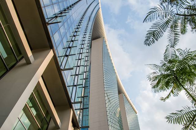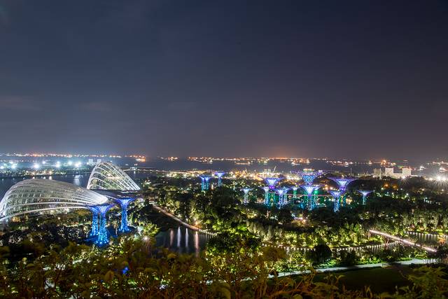 酒店的东面是滨海湾公园,一到晚上这里附满藤蔓的擎天大树灯光秀成为滨海湾的标志性景点。这些大树照明都是利用的太阳能供电。