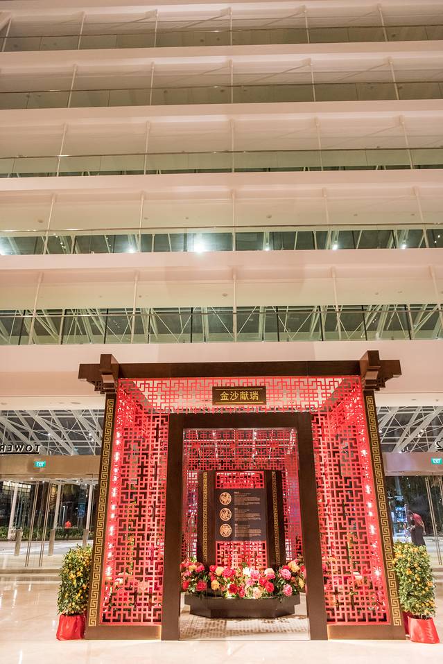 春节期间金沙酒店在大门口特地摆放的中式花窗风格的花亭。