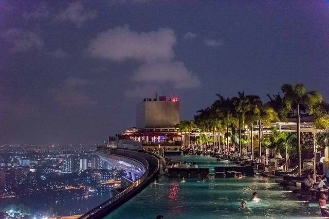 ▲Marina Bay Sands五十七层,入夜后更加灯红酒绿,眺望灯光璀璨的滨海湾,伴随萦绕在泳池周遭超强节奏感的爵士乐曲,吹着略带湿咸气息的晚风。