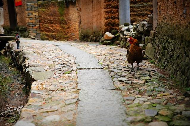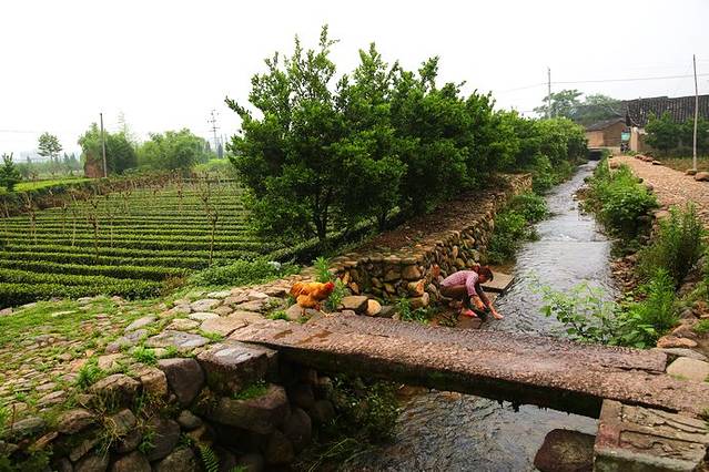 溪水绕村而过,溪流之上,石板为桥。一位农妇在溪水里洗衣,恰一只花鸡从石桥上走过,好一派悠闲的田园风景。
