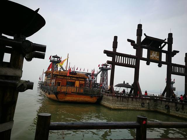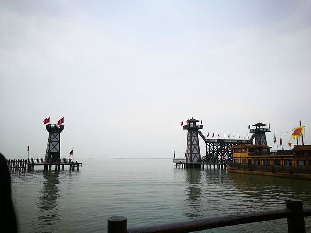 从酒店打车到鼋头渚,无耐遇上清明节本地人扫墓,所以从蠡园到鼋头渚这条路是堵的,于是在蠡园下了车,在“去哪儿网”上面买了两张三国水浒城的门票(套票来的,也可以单买三国城或者水浒城),这里特别说一下,无锡的景点很特别,在网上买的优惠票属于团体票,必须要在指定地点集合,然后统一坐中巴车由导游带着去景区门口买票,不像深圳,直接在网上买了,发个电子码自己过去就可以了。所以我们在指定的蠡园门口等待上车,蠡园也是一景,据说是范蠡和西施双双归隐之地,因时间不早了,我们便没有进去。集合上车后到三国城都已经10点多了。基本上看不了什么节目了,只能在里面溜达溜达,导游先给我们买了门票,接着忽悠我们买了游览车票,个人认为真没必要买电瓶车票,因为景区不大,走一圈半小时就差不多了,而且电瓶车是在指定景点停靠上下车,不是招手就停随意上下车。每个景点之间走路就几米,里面有租自行车的,完全够用了,所以我去,被坑了。电瓶车可以坐到水浒城,可水浒城和三国城是紧连着呢,三国城又不大。好了,拐回正题,导游带着我们先去坐了船,在吴王水营,坐的诸葛号,两层的游船,和三国演义(经典版)里面卧龙先生带着刘备去娶东吴孙尚香时坐的船一模一样。吴王水营还有另一艘周瑜号,也和电视里面的战船一般无二,是三层的,我们上诸葛号时,刚好周瑜号到岸,三层船上密密麻麻全是人,感觉像是逃难过来的。