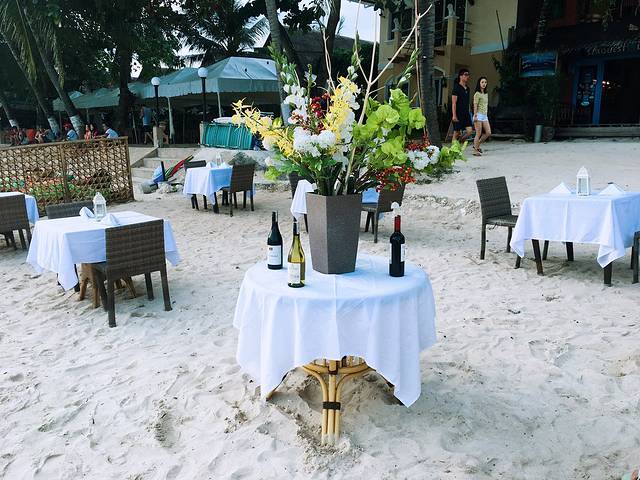 临近傍晚,Alona沙滩边的餐厅已经准备好了露天的晚餐桌子,摆上鲜花和红酒,等待客人的到来