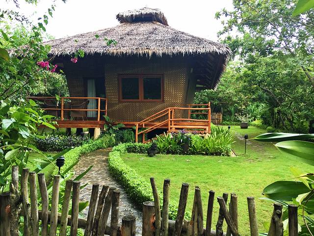 这是一个有私人沙滩,东南亚特色的房屋构造,和成片热带树林的度假村酒店。