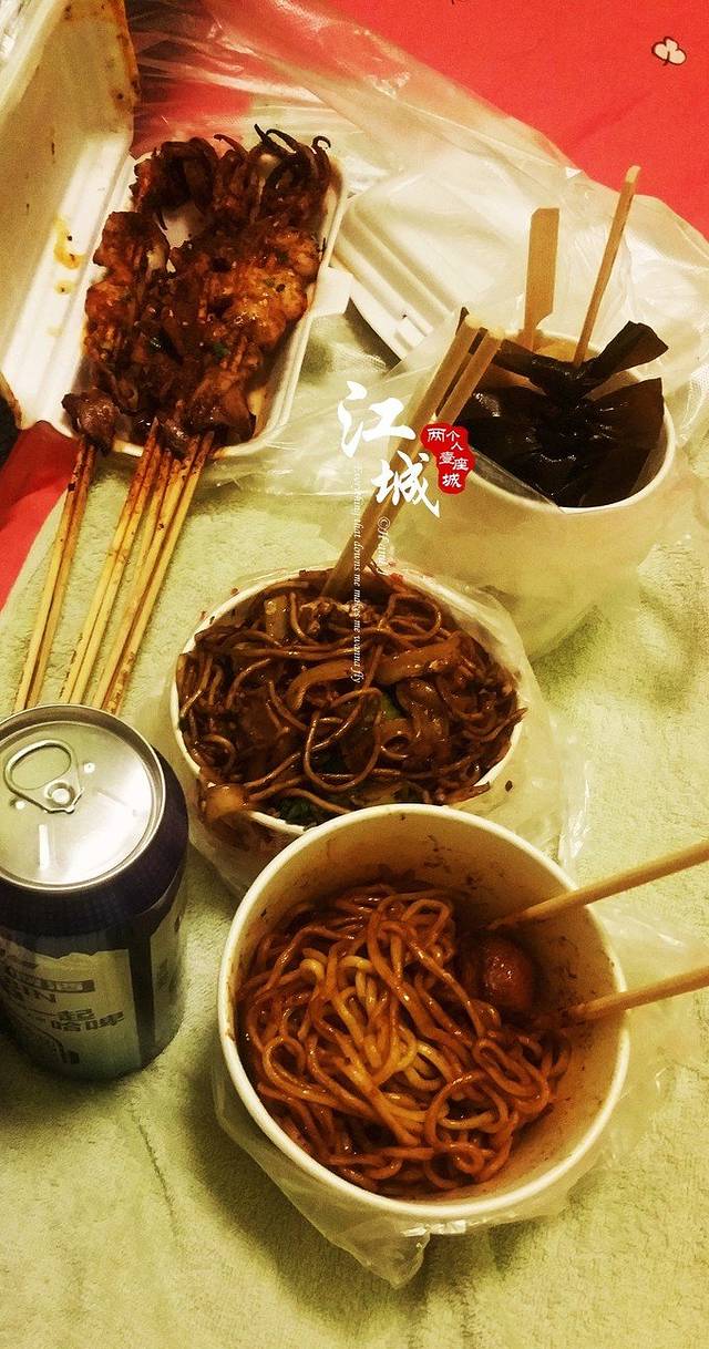 由于时间有些晚,大部分餐厅都关门了,Joy又想吃烤鱿鱼,于是我们就在江汉路附近的夜市小吃摊和便利店买了些东西做夜宵