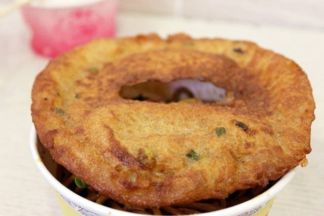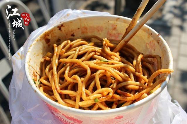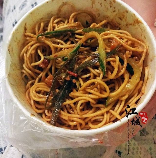 小吃摊的炒豆丝炒面(上面厚厚的是烤豆腐啦)。豆丝我是第一次吃,来武汉之前就对豆丝这种食物有些好奇,这次正好吃到。完全不是想象中的那种脆脆的样子,而是软软厚厚的。我个人还是挺喜欢的。