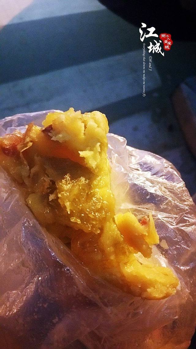 于是在户部巷选了一家。买了一个甜口的,拿在手里挺实诚的,头上沾了糖粉。吃着又香脆又柔软,还甜甜的,我觉得很好吃呢。