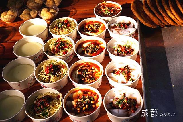在成都,最让人牵肠挂肚的必定是美食。大街小巷上能轻易找到布满红油鲜辣佐料的小吃,甜水面、钟水饺、龙抄手、担担面、三大炮、叶儿粑、钵钵鸡、夫妻肺片、麻婆豆腐、肥肠粉、酸辣豆花……从蒸煮烘烤到油酥油炸,应有尽有。四川人善用花椒,青红间杂,颜色鲜艳欲滴,口味麻辣兼备,令人食欲大振。