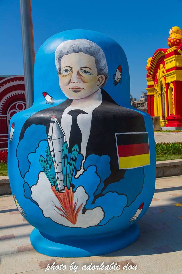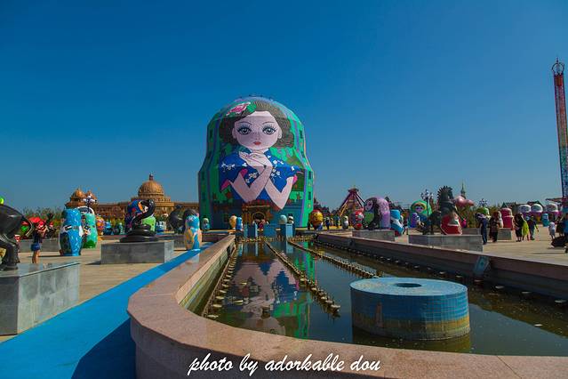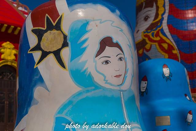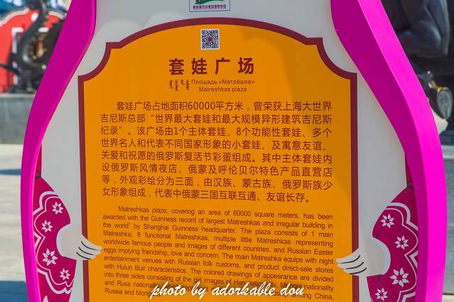 广场中心,有一个高大的套娃,即主题套娃,绕其转圈,可发现有三个面:一位蒙古姑娘,一位汉族姑娘和一位俄罗斯姑娘,寓意着蒙俄中三国和谐相处。这个主题套娃不但是一个俄罗斯套娃教堂,还是一个大型的西餐厅
