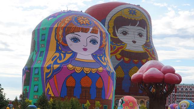 套娃广场共有将近200个造型各异、服装不同的套娃。套娃餐厅、套娃酒店,就连公共卫生间也是套娃造型的。