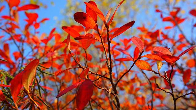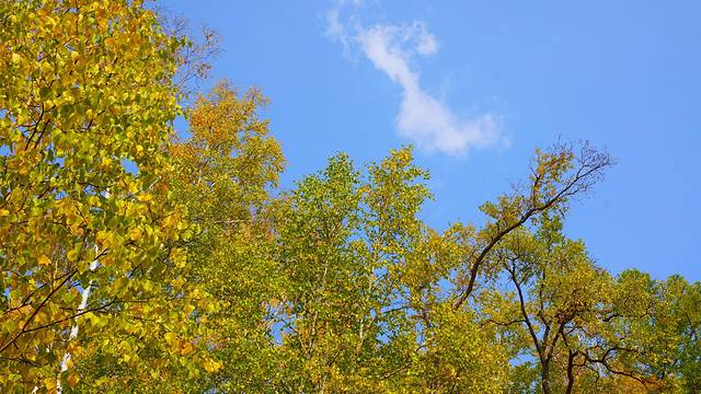 白色树干,黄色、红色树叶,蓝色天空。