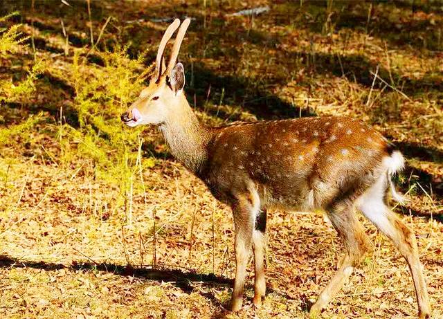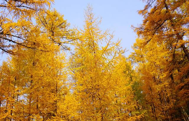 秋色不单调,有铁红的叶子、洁白的桦树、茶青的苍松点缀其间;秋色也不呆板,间或有风儿拂过,缤缤纷纷的金黄色松针簌簌飘下,如细细密密的睫毛,在秋阳下忽闪着迷人的光。