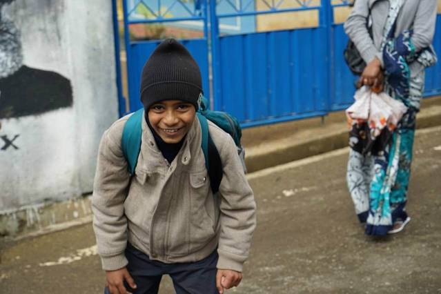 路上遇到放学的孩子们,面对镜头有些羞涩的笑