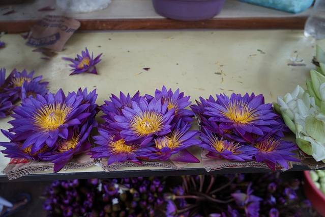 佛牙寺门口摆放着用来祈福的花,好漂亮的