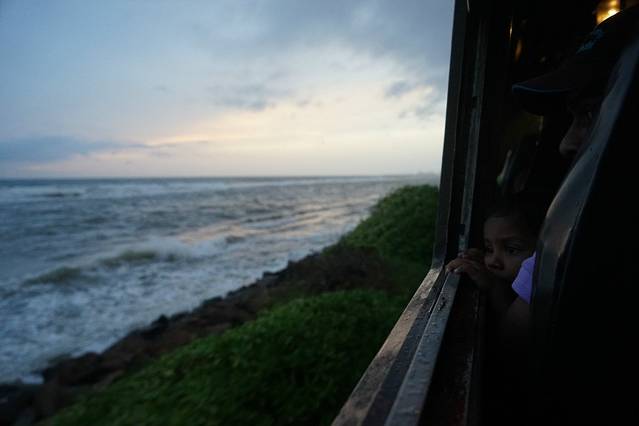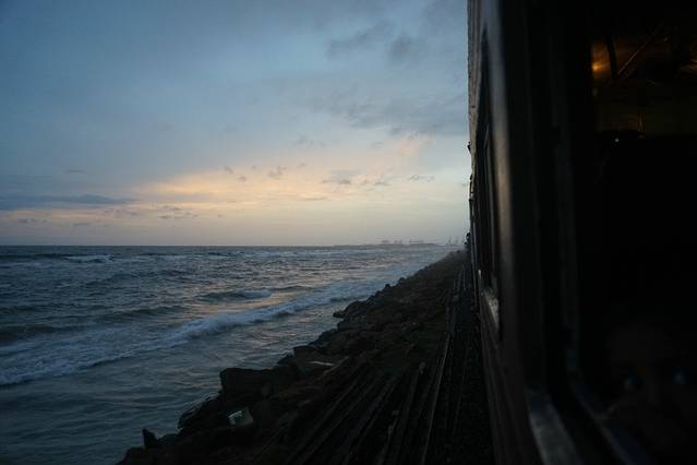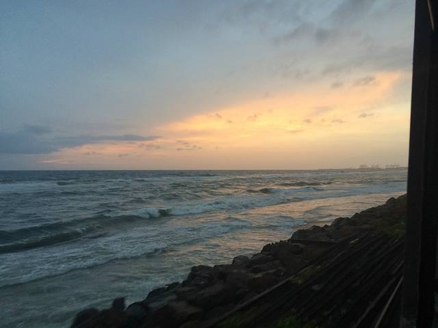第一次感受火车窗外的景色不是高山、不是田野、不是山岭、不是湖泊,而是这湛蓝无边的大海,心情很激动,一直抱着相机,想要留下美好的瞬间。可惜天公不作美,途经最好的景色的时候都在下雨,连车窗都不敢打开。好在最后快到科伦坡的时候看到了晚霞,抢下了几张海上火车的图片。不过那样震撼人心的美景已经深深的印在了我心里。